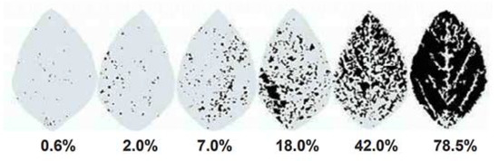 Diagrammatic scale proposed by Godoy et al. (2006) [34] for the severity of Asian soybean rust.
