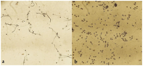 Difference between germinated and inhibited uredospores: (a) Germinated uredospores (Negative control); (b) non-germinated P. pachyrhizi uredospores (UFV LPP B155-BS + C).