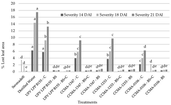 In the first evaluation, 14 days after inoculation (DAI), it was already possible to observe (Figure 3) a slight progression of the disease in all treatments, except the one where Serenade® was applied. However, the severity of the disease was significantly lower in the treatments composed of biosurfactants and by biosurfactants and bacterial cells, which did not differ statistically from each other. The observed severity is quantified based on a diagrammatic scale that considers the leaf area lost to the lesions.