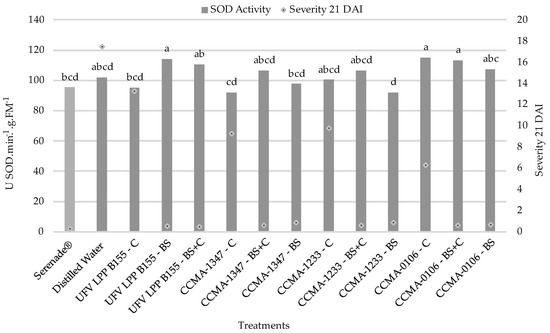 SOD Activity 21 days after pathogen inoculation. UFV LPP B155 and CCMA-1347 = B. subtilis; CCMA-1233 = B. licheniformis; CCMA-0106 = P. aeruginosa. BS: Biosurfactants; C: Bacterial cells; BS + C: Biosurfactants + Bacterial cells. Bars followed by the same letter do not differ from each other by Tukey’s test α = 0.05. The primary Y-axis shows activity in U SOD·min−1g·FM−1, and the secondary Y-axis shows severity, represented by the dark-colored dot. Different letters reveal statistically significant variations (p < 0.05).