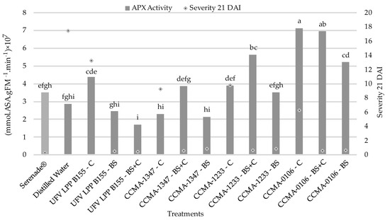 The APX enzyme (Figure 6) showed greater variation between treatments, where a significant increase can be observed for treatments containing cells (C and BS + C) of P. aeruginosa strain CCMA0106, where their presence led to the highest values for the activity of this enzyme. For the B. subtilis strain LPP B155, the presence of biosurfactants led to lower enzyme activity, as well as lower disease severity, which also increased in the absence of biosurfactants. For the treatments containing the strains CCMA1347 and CCMA1233, the combination of cells and biosurfactants (BS + C) led to a higher value in enzyme activity when compared to the isolated treatments (BS and C).