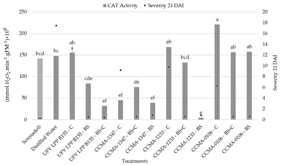 CAT activity 21 days after pathogen inoculation. UFV LPP B155 and CCMA-1347 = B. subtilis; CCMA-1233 = B. licheniformis; CCMA-0106 = P. aeruginosa. BS: Biosurfactants; C: Bacterial cells; BS + C: Biosurfactants + Bacterial cells. Bars followed by the same letter do not differ from each other by Tukey’s test α = 0.05. The primary Y-axis shows activity in mmol H2O2·min−1·gFM−1, and the secondary Y-axis shows severity, represented by the dark-colored dot. Different letters reveal statistically significant variations (p < 0.05).