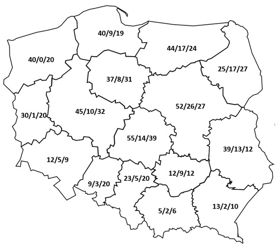 Number of pairs of soil-plant samples taken in Polish provinces: wheat/maize/rape.