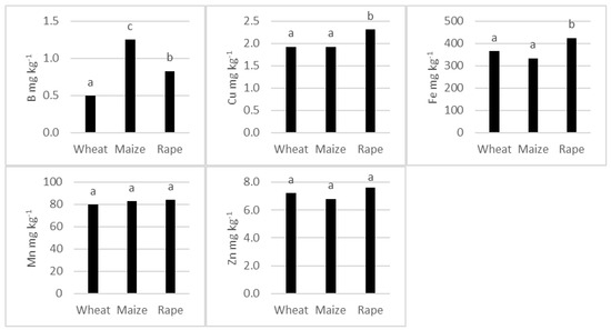 The soil taken from the fields where wheat, maize and rape were grown differed significantly in the mean concentration of B, Cu and Fe, while there were no differences in the content of Mn and Zn (Figure 2).