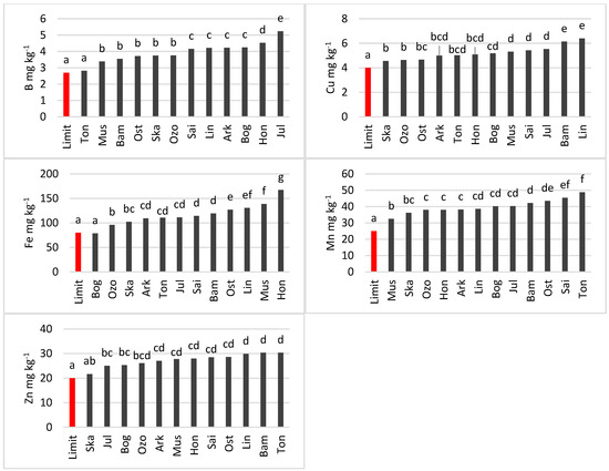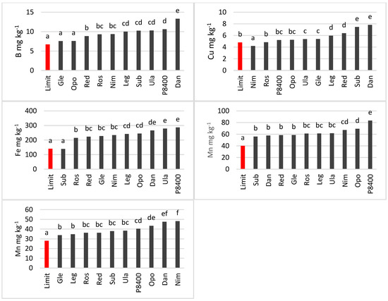 The wheat cultivars tested were sufficiently supplied with all micronutrients (Figure 4). No lower concentrations were found in the shoots than the deficiency limits set by Korzeniowska et al. (2020). However, the individual cultivars differed in their micronutrient levels. For each micronutrient, it was possible to distinguish groups of cultivars with similar contents of this element, i.e., cultivars between which there were no significant differences. In contrast, significant differences were observed among groups. In some cases, one cultivar was classified in two or even three groups (Figure 4).