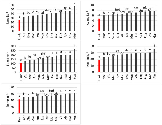 Cu content varied less than B content. In the group of cultivars that included Marcopolos and Sherlock (b), an average Cu concentration was 6.1 mg kg−1. The highest concentration of this element (7.8 mg kg−1) was presented by Garou (h).