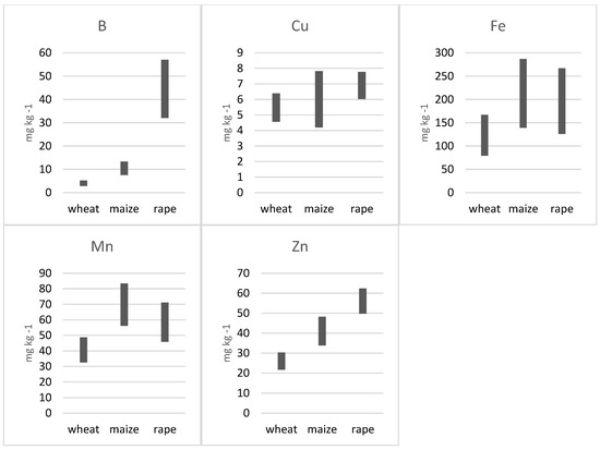 The ranges of microelements in the shoots of the studied species presented in Figure 7 were determined on the basis of the micronutrient concentrations in cultivars. It was observed that for some micronutrients, the ranges for wheat, maize and rape partially overlapped, and for other micronutrients were completely divergent. The greatest difference between species was found for B. The range of B in rape (32–57 mg kg−1) differed significantly from that found in wheat and maize. At the same time, the concentration of B in all maize cultivars (7.5–13.3 mg kg−1) was higher than in wheat cultivars (2.8–5.2 mg kg−1).