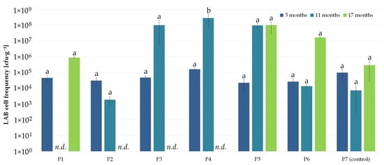 Figure 1. Lactic acid bacteria (LAB) population changes in silage during the first experimental stage. Storage time: 5, 11 and 17 months. Bars marked with the same letter indicate no statistical difference (p < 0.05); n.d.—not detectable.