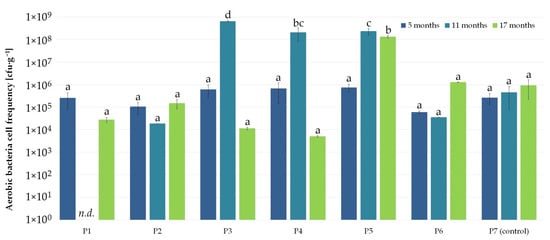 Figure 2. Aerobic bacteria population changes in silage during the first experimental stage. Storage time: 5, 11 and 17 months. Bars marked with the same letters indicate no statistical difference (p < 0.05); n.d.—not detectable.