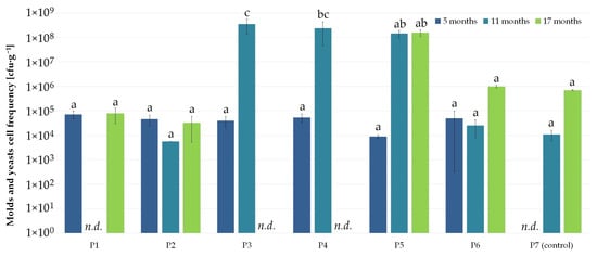 Figure 3. Mold and yeast population changes in silage during the first experimental stage. Storage time: 5, 11 and 17 months. Bars marked with the same letters indicate no statistical difference (p < 0.05); n.d.—not detectable.