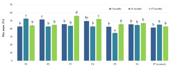 Figure 4. Silage dry mass [%] changes during bale storage for 5, 11 and 17 months. Bars marked with the same letters indicate no statistical difference (p < 0.05).