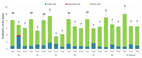 Figure 6. Changes in organic acid content in silages stored for 5, 11 and 17 months. Bars marked with the same letters indicate no statistical difference (p < 0.05); statistical significance analysis was performed for the sum of organic acids.