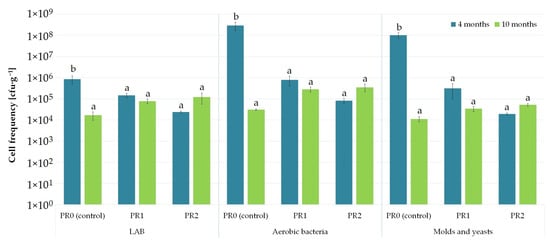 Figure 7. Microbial population changes during the second stage of the experiment. Storage time: 4 and 10 months. Bars marked with the same letters indicate no statistical difference (p < 0.05); results were analyzed separately for each group of microorganisms.