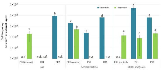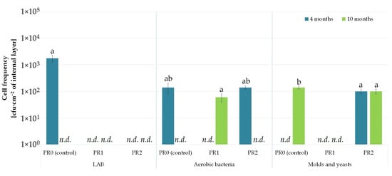 Figure 9. Microbial colonization of outer film surfaces during the second experimental stage. Storage time:4 and 10 months. Bars marked with the same letters indicate no statistical difference (p < 0.05); results were analyzed separately for each group of microorganisms; n.d.—not detectable.