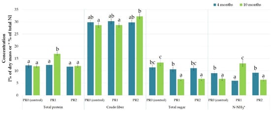 Figure 10. Silage parameters in the second stage of the experiment during storage for 4 and 10 months. Bars marked with the same letters indicate no statistical difference (p < 0.05); results were analyzed separately for each parameter, * for ammonia nitrogen the concentration was presented as % of total nitrogen.
