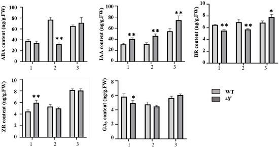 The contents of ABA, IAA, ZR, BR and GA3 in WT (14–345) and slf leaves at the fourth-leaf stage (1), fifth-leaf stage (2) and seventh-leaf stage (3). Asterisks denote significant differences (* p < 0.05; ** p < 0.01) as determined by Student’s t-tests.