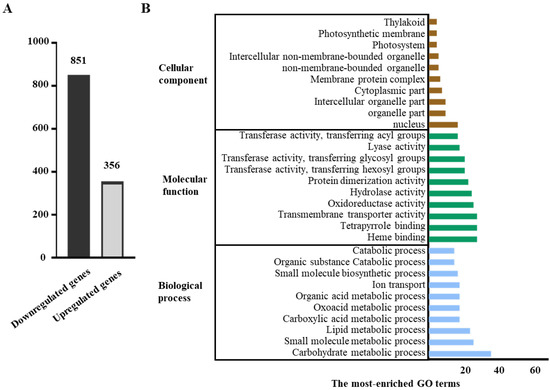 Three biological replicates were designed for each genotype. The RNA quality analysis, cDNA library preparation and sequence analysis were conducted by the Novogene Technology Company, Beijing, China. Quality of RNA was checked by determining the RNA integrity and concentration using RNase-free 1% agarose gel electrophoresis, RNA Assay Kit in Qubit2.0 Flurometer (Life Technologies, Carlsbad, CA, USA) and RNA Nano6000 Assay Kit of the Bioanalyzer 2100 system (Agilent Technologies, Palo Alto, CA, USA). Sequencing libraries were generated using the NEBNext UltraTM RNA Library Prep Kit for Illumina (NEB, Ipswich, MA, USA) following the manufacturer’s recommendations. Index codes were added to attribute sequences to each sample [50,51]. The gene expression level, differential gene expression analysis and Gene Ontology (GO) enrichment were performed by using the feature Counts v1.5.0-p3, the DESeq2 R package (1.16.1) (Novogene Technology Company, Beijing, China) and the cluster Profiler R package [52,53,54].
