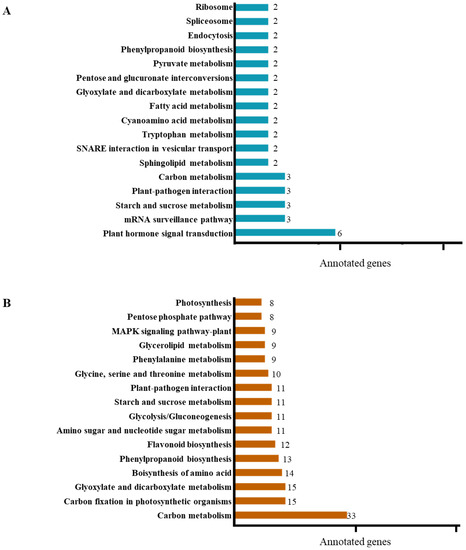 Statistical analysis of annotated unique genes in KEGG pathways in WT (14–345) vs. slf. (A) Upregulated genes in KEGG pathways in WT vs. slf. (B) Genes downregulated in KEGG pathways in WT vs. slf.