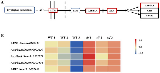 Differentially expressed genes (DEGs) in the auxin signaling pathway. (A) Auxin signaling pathway regulates the expression of auxin-responsive genes through the F-box protein TIR1 and cooperative action of Aux/IAA transcriptional repressors and ARFs. Red rectangles represent genes that were significantly upregulated in slf vs. WT (B) Expression levels of DEGs in the auxin signaling pathway in the WT and slf samples. Values are the mean ± SE of three biological replicates.
