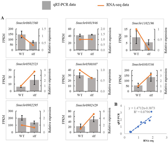 qRT-PCR verified the results of RNA-seq. The column diagram and line chart represented the data from qRT-PCR and RNA-seq, respectively. (A) The gene expression levels of qRT-PCR were normalized using the relative expression level of the internal control, tubulin gramma and WT (14–345) expression levels were normalized to 1. The data presented are the means from three biological replicates. (B) Pearson’s correlation of gene expression ratios (slf/WT) between RNA-seq and qRT-PCR. The correlation of the fold change was analyzed by RNA-seq (x-axis) with qRT-PCR (y-axis) data.