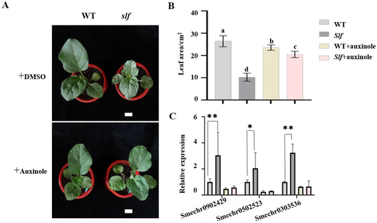 Under control treatment, slf shows a small leaf compared to WT; however, the leaf size of the slf mutant was significantly increased under auxinole treatment (Figure 7A,B). We then tested the expression of Smechr0902429, Smechr0303536 and Smechr0502523, which have been shown to be upregulated in slf, as shown in transcriptome analyses. These three genes were significantly downregulated in both WT and slf under auxinole treatment compared to the control (Figure 7C). These data suggested that enhanced auxin signaling and upregulation of the Aux/IAA genes are responsible for the small leaf phenotype of slf. Interestingly, other SmAux/IAA genes, such as Smechr0601560 and Smechr0101209, were changed little in slf but decreased significantly in WT under auxinole treatment compared to the control (Supplementary Materials Figure S1), and the leaf size of WT was slightly decreased compared to that of the control (Figure 7A,B).