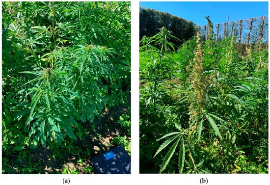 Eight-week-old hemp plants used for volatile collection: (a) Female hemp plants; (b) Male hemp plants.