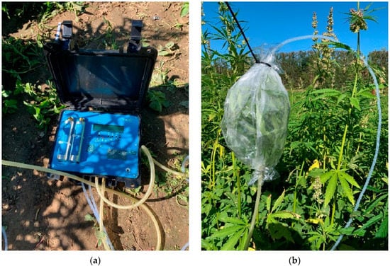 The volatile collection procedure: (a) Portable PVAS22 pump; (b) plant material bagged and fastened to create an enclosed system for volatile collection.