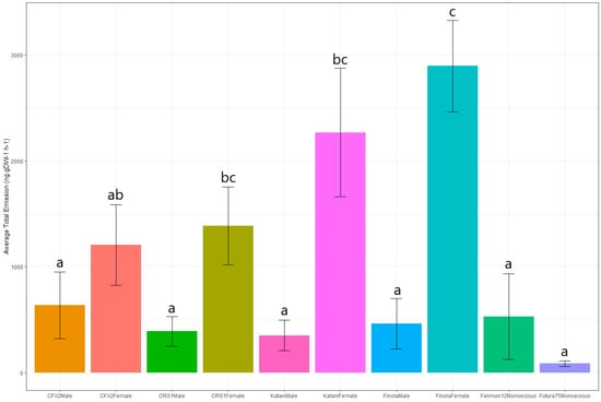 Total VOC emissions (ng g DW−1 h−1) from six New Zealand grown hemp cultivars (four dioecious and two monoecious). Datasets for dioecious cultivars are separated by sex (male or female). Data are presented as mean ± SEM (n = 80). Different letters indicate a significant difference in emissions between the cultivar × sex interactions.