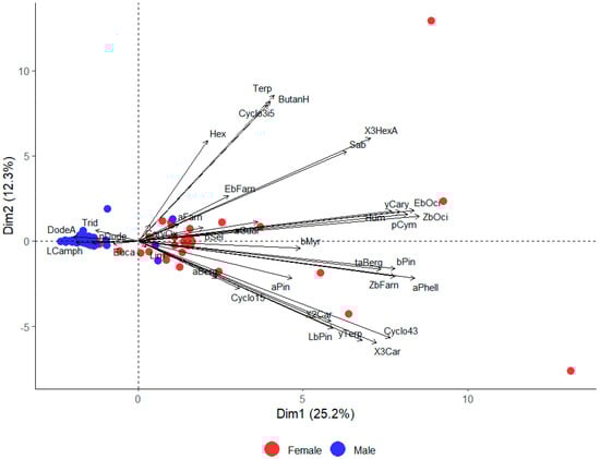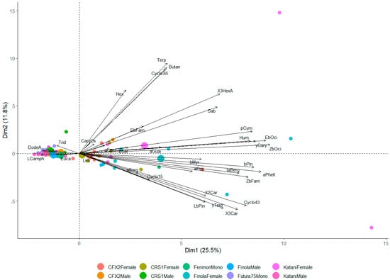 A principal component analysis (PCA) was used to further explore the differences in hemp VOC emissions between the sex × cultivar interactions. The PCA revealed a high overlap between the volatile profiles; however, the females of the Finola and Katani cultivars showed slight separation from the other sex × cultivar interactions along the first axis (Dim 1) (Figure 4). The first axis of the PCA (Dim1) explained 25.5.% of the total variance in emissions among the six hemp cultivars. This axis was mostly characterized by (Z)- β-ocimene and (E)-β-ocimene (ZbOci and EbOci in Figure 4).