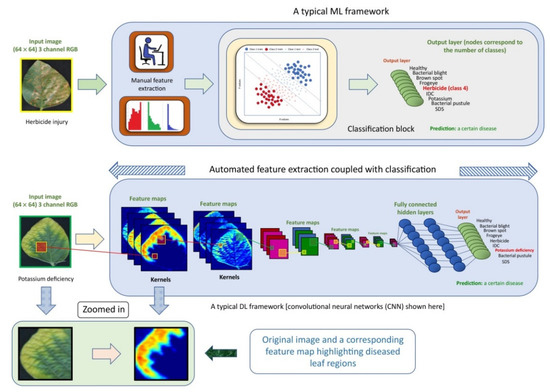 The intelligent detection of plant diseases has received increasing attention in recent years. Crop diseases negatively affect agricultural production [72]. Early detection and control of crop diseases play a crucial role in the management of and decision making involved in agricultural production. Traditional machine learning approaches to feature analysis of crop photographs can detect diseases earlier than human observation. Nevertheless, such methods focusing on a limited number of crops were usually performed on small data sets. In recent years, methods based on deep learning and image technologies have been widely used in plant pathology.