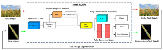 The architecture of the mask region convolutional neural network (Mask-RCNN) approach for wheat Fusarium head blight (FHB) disease assessment [85].