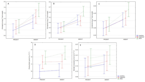The higher values, for exemple, of chlorophyll a and chlorophyll b in leaves of peach trees grown in soil in the absence of Paspalum notatum can be explained by the greater availability of mineral N forms, including in soil with urea and organic compost applications. This increases the potential for N uptake by plants and increases N concentration in the tissue. Part of the absorbed N may be part of the chlorophyll molecule, being formed by the association between a central Mg atom (pheophytin complex) and four N atoms from four symmetric pyrrole rings [38]. The higher values of carotenoids, which were also observed in peach trees with urea application and without Paspalum notatum, can be explained because these compounds act in preventing photo-oxidative damage, caused by highly reactive oxygen species produced in photosynthesis [39,40].