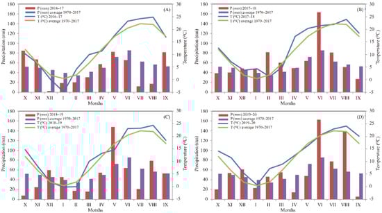 Long-term average (LTA) and total monthly precipitation (P) and average monthly air temperature (T) for hydrological years (A) 2016−2017, (B) 2017−2018, (C) 2018−2019, and (D) 2019−2020. Bars and left y−axis represent precipitation, and right y−axis and lines represent temperature data.