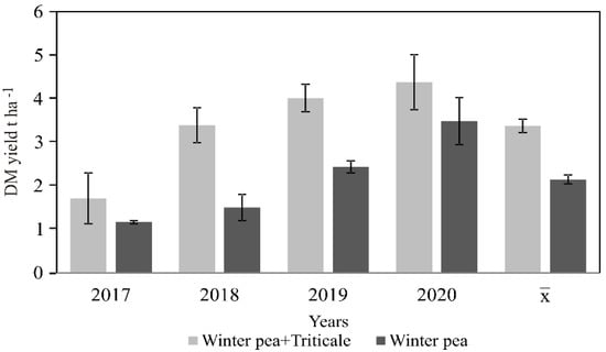 Our study showed that climatic conditions significantly modified overall cover crop performance while increasing the sensitivity of the main crop to weather conditions (Figure 3). This is particularly noticeable in 2017, when the lack of precipitation (first during the winter period, and later during the spring) suppressed their growth, and decreased the yield. During the four years of research, the average dry matter yield of cover crops was higher in the mixture of pea and triticale (3.4 t ha−1) compared to peas as a sole crop (2.1 ha−1) (Figure 3). Similar to our results, Ref. [66] states that mixed cover crops have a higher forage yield and a better nutrient balance for ruminant feed than sole cropping. On the other hand, the plowing of a cereal/legume mixture results in a larger amount of dry matter incorporated into the soil as green manure [67], which affects the soil’s physical properties and soil air regime [68].