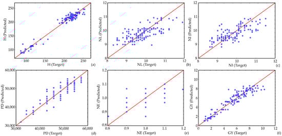 Comparison of experimentally obtained values of (a) H, (b) NL, (c) NI, (d) PD, (e) NE, and (f) GY, with ANN predicted values.