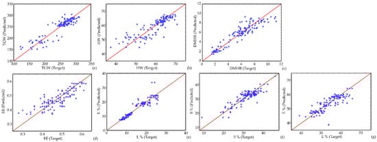 Comparison of experimentally obtained values of (a) TGW, (b) HW, (c) DMHR, (d) HI, (e) L, (f) S, and (g) E, with ANN predicted values.