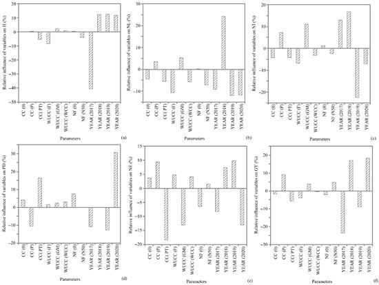 The relative influence (%) of CC, WUCC, NF and YEAR on (a) H, (b) NL, (c) NI, (d) PD, (e) NE, and (f) GY, determined using Yoon’s interpretation method.