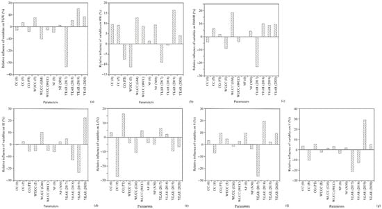 The relative influence (%) of CC, WUCC, NF, and YEAR on (a) TGW, (b) HW, (c) DMHR, (d) HI, (e) L, (f) S, and (g) E, determined using Yoon’s interpretation method.