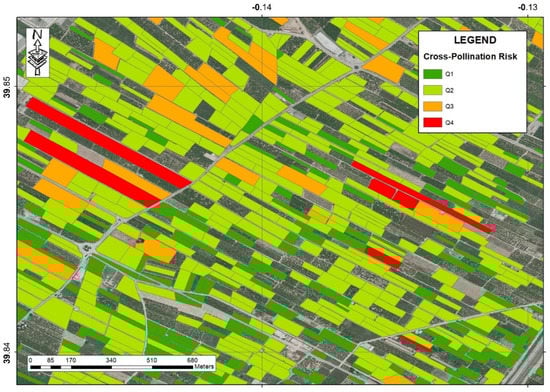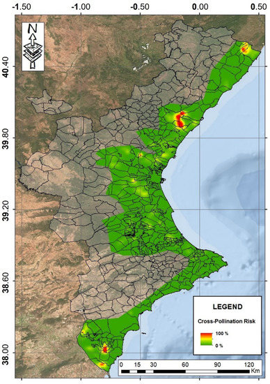 This work focuses on spatially representing cross-pollination risks that affect citrus orchards in Spanish conditions, because, once the orchards have been planted, it is highly expensive to replant them. Cross-pollination risks of an orchard derive from the variety that is planted, the amount of plan material, its location, and these same characteristics of the surrounding citrus orchards and the presence or absence of pollinators. However, the probability of pollination occurring depends on meteorological and climatic factors combined with the abundancy of pollinators and landscape configuration.