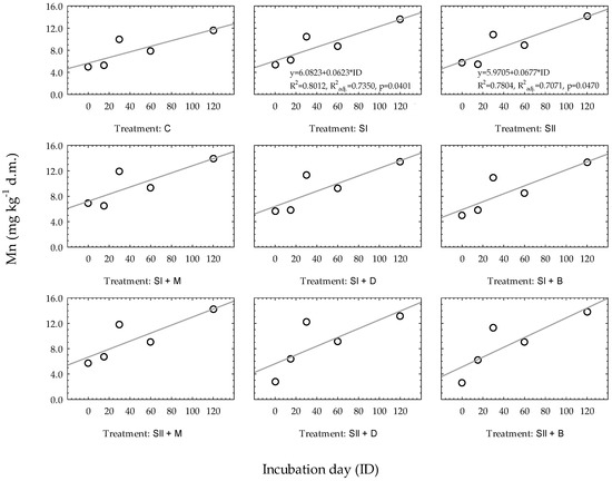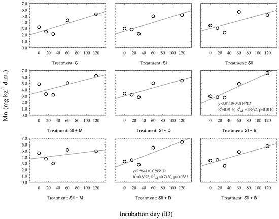 As shown in Figure 3, only two simple regression models of Mn changes in heavy soil were statistically significant, and both of them were amended with waste sulfur at dose I and dose II (SI and SII, respectively). The coefficients of determination (R2) for the presented regression equations ranged from 0.8012 (SI) to 0.7804 (SII), and the adjusted coefficients of determination (R2adj.) reached values from 0.7350 to 0.7071, respectively. Other linear models were less accurate: R2 ranged from 0.5934 to 0.7287, and p values were below 0.05.