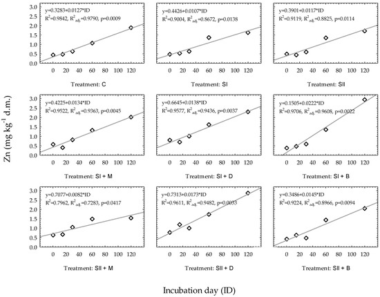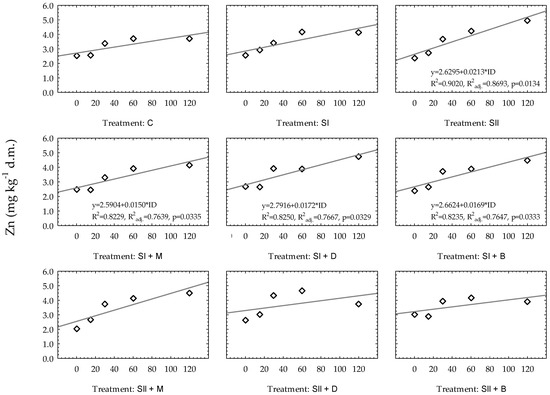 Contrary to the observed statistical significance of the models of Zn in all treatments for very light soil, for heavy soil, only four regression models had p values lower than 0.05 (Figure 4). In heavy soil, Zn changes over time were predicted the most accurately in the following treatments: SII (soil with the addition of waste sulfur (sulfur dose: II); R2 = 0.9020, R2adj. = 0.8693), SI + M (waste sulfur (sulfur dose: I) and manure; R2 = 0.8229, R2adj. = 0.7639), SI + D (waste sulfur (sulfur dose: I) and digestate; R2 = 0.8250, R2adj. = 0.7667) and SI + B (waste sulfur (sulfur dose: I) and biochar; R2 = 0.8235, R2adj. = 0.7647). In other cases, the models were not significant (p > 0.05), and R2 ranged from 0.4681 to 0.8777. An additional statistical analysis allowed the authors to develop significant polynomial regression models for SI (soil with the addition of waste sulfur (sulfur dose: I); R2 = 0.9850, R2adj. = 0.9699; ) and for SII + M (waste sulfur (sulfur dose: II) and manure; R2 = 0.9683, R2adj. = 0.9365; ). Linear models were not statistically significant for these experimental treatments.