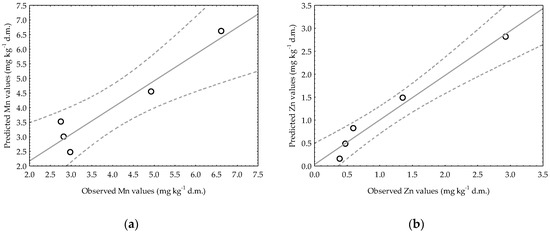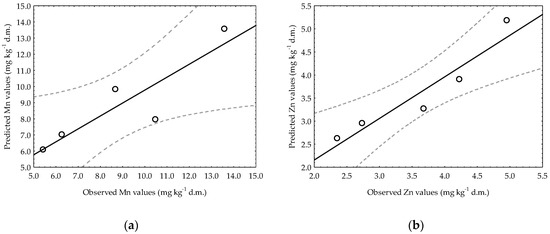 A similar procedure for plotting observed versus predicted data was used for the chosen time models developed for heavy soil (Figure 6). Treatment SI for Mn and treatment SII for Zn were selected according to their statistical significance. In addition, the highest possible value of the coefficient of determination R2 was chosen, which was 0.8012 for Mn (SI) and 0.9020 for Zn (SII). For heavy soil data, the data points for the Zn model are much closer to the projected regression line, and it can be concluded that the regression model fits the data reasonably well and much better than that of Mn.