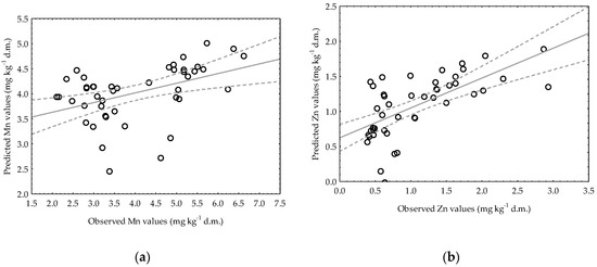 Observed versus predicted plots of linear regression models of Mn (a) and Zn (b) content changes over time in heavy soil for SI treatment (Mn) and SII treatment (Zn); these experimental combinations were chosen because they had the highest R2 values (R2 = 0.8012 for Mn and R2 = 0.9020 for Zn).