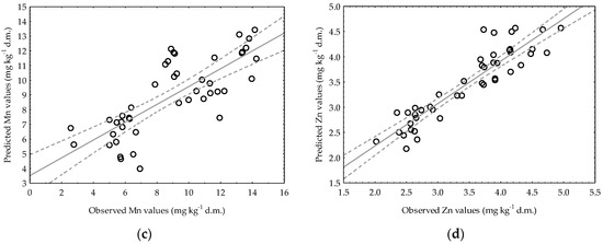 It can be seen that in Figure 7a,b, the observed data and their adjustment to the regression line are rather dispersed. As mentioned before, the only case when the variable indicating the activity of dehydrogenase remained in the regression equation was the model describing the availability of Mn in very light soil. Despite the fact that the statistical analysis proved the significance of the model, the coefficient of determination was very low (R2 = 0.1934), indicating the poor fit and precision of the model. For a given model, there was higher variability around the regression line (Figure 7a), which is the reason for its lower R2 value. In very light soil, the regression equation for Zn consisted of pH, but the accuracy of the model was much lower compared to that obtained for Zn in heavy soil, as evidenced in Table 5 by R2 (0.4257) and Se (0.5072), together with the visual presentation in Figure 7b. The equation for Mn in heavy soil (Figure 7c), which contains an explanatory variable denoting soil pH, is characterized by a high coefficient of determination (R2 = 0.6060), although the Se value should be considered quite high (2.0888). The regression line approximates the real data points quite well for Zn in heavy soil, which can be observed in Figure 7d, and the model can explain around 84% of the Zn content variability in the soil. Judging by the Se value, when predicting the value of the dependent variable (Zn), the authors made an error of 0.3164 mg kg−1 d.m.
