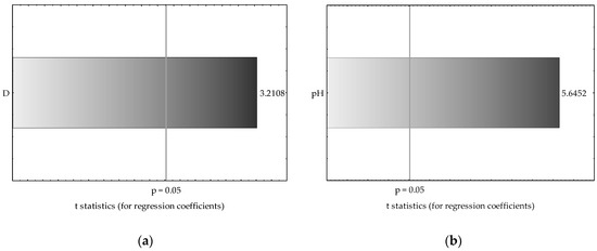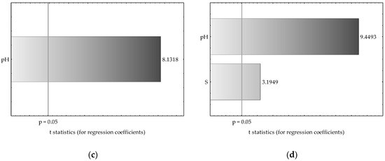 Multiple regression analysis resulted in a significant relationship between Mn and Zn availability in very light and heavy soils and some of the explanatory variables (soil pH, S-SO4 content and dehydrogenase activity). The results are also presented using a Pareto chart of t-values for the regression coefficients (Figure 8). The Pareto chart shows the size of the effect that each variable involved in the regression model has on the dependent variable (Mn and Zn) in decreasing order, and the line going across the columns indicates how large an effect has to be (i.e., how long a column must be) to be statistically significant. The columns of the plot are in proportion to the calculated values of the t-statistics of each effect. As observed, soil pH was a predictive variable for Zn availability in light and heavy soils as well as for Mn content in heavy soil. The sulfate sulfur content itself seemed to also be an important predictor for Zn content in heavy soil, but less significant than the pH value. In this case, higher values of the t-score for pH in comparison to the S-SO4 content indicate that a large difference exists between these two variable inputs (approximately 3-fold). The availability of Mn in very light soil significantly depended mostly on dehydrogenase activity.