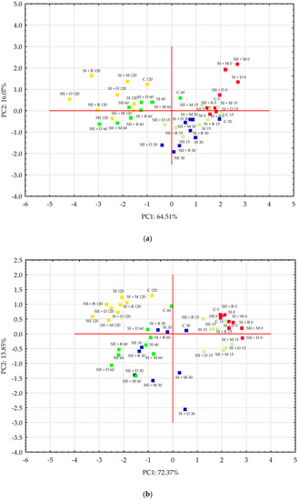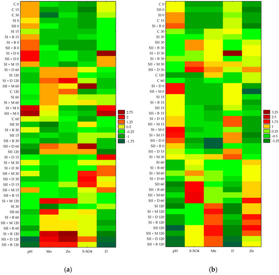 Figure 9 reports the heatmaps obtained analyzing the four determined soil parameters (i.e., soil pH, dehydrogenase activity, S-SO4, and Mn and Zn contents) that differed among treatments. Two heatmaps, referring to very light soil (Figure 9a) and heavy soil (Figure 9b), were created. The color pattern ranges from dark green for the lowest values and increases gradually until becoming dark red for the highest values. Particular patterns in the heatmaps differed between the very light and heavy soils (values were higher for heavy soil, as is shown in the figure legend). In addition, the arrangement of the treatments shown on the left side of both heatmaps’ panels is different between very light and heavy soils. Interesting groups of dependencies can be observed; for example, the lowest pH was found in samples of heavy soil, especially after 60 and 120 incubation days, together with lower dehydrogenase activity and higher Mn content (for all treatments after 120 incubation days), and the Zn content, in most cases, also increased after a longer incubation time. A high content of available sulfur was found on the 60th day of incubation when a double dose of sulfur was applied at the beginning of the experiment. Light soil samples usually had higher pH at the beginning of the experiment and then fell, but to a lesser extent than heavy soil, in the following measurement days, being lower after 120 days of incubation. Greater amounts of Mn and Zn were observed on day 120 of incubation, especially for treatments including biochar and digestate for SI and SII and manure for SI. In the initial period of the experiment, the content of S-SO4 in the very light soil samples was low; only on the 15th day (SII + D), the 30th day (SII + D and SII + M) and especially on the 60th day of incubation (SII + D and SII + M) did the values turn out to be the highest. Conversely, the higher activity of dehydrogenase, regardless of the treatment, was observed in the first days of the experiment, up to the 30th day of incubation.