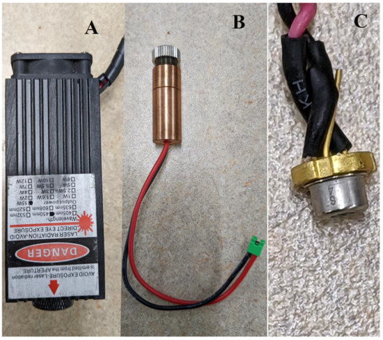 Diode lasers. (A) diode laser with heat sink enclosure including a fan, (B) diode laser without a cooling fan, and (C) exposed diode laser.