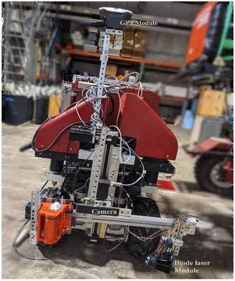 The main objective of this study was to investigate the effectiveness of low power diode lasers on killing weeds. Diode lasers (Figure 1) emit the beam by passing current through a semiconductor. They have the advantage of being small, widely available, inexpensive, requiring low voltage and low current. Their uniqueness in size, weight, costs coupled with their high efficiency and reliability, makes them easier to integrate in systems [29], as opposed to other types of lasers available in the market, such as CO2 and Fiber lasers. CO2 lasers are relatively bulky, and require more voltage, current and a separate cooling system when operating in an outside environment while fiber lasers are the most powerful and most expensive of the three. Since the aim is to use the laser in a robotic platform (Figure 2), CO2 and fiber lasers present a more challenging setup in terms of portability and costs. Furthermore, looking at laser safety, the laser beam turns into heat energy when it hits a surface. High energy lasers can potentially ignite materials and can cause thermal injury to a person [28]. Using diode lasers of low output power present less operational danger than the high-powered and more complicated CO2 and fiber lasers; however, it can still cause damage to the eyes on exposure, so, proper caution wearing protecting glasses is necessary [28].