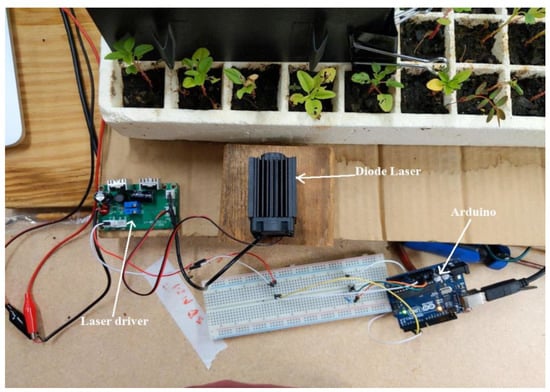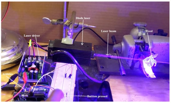 Lasers have emerged as one of the solutions that have a potential to be effective in targeted elimination of weeds. Treating weeds with laser beam can be efficient in controlling the growth of weeds [21,22,23,24,25,26,27]. Using narrow CO2 laser beams (output powers of 4 W, 10 W, and 20 W), Heisel et al. [21] were able to cut weed stems, while using diode lasers (5 W and 90 W), Mathiassen et al. [25] showed laser beam can raise the temperature of the water in the plant cells and delay or stop its growth without the need to cut the stem completely. Woltjen et al. [27] studied the effects of both CO2 and diode lasers treatments on plants and discovered different degrees of effectiveness in hindering the growth of plants. Furthermore, using a 25 W fiber-coupled diode laser Coleman et al. [26] demonstrated the potential of lower energy laser in controlling weeds at different growth stages.