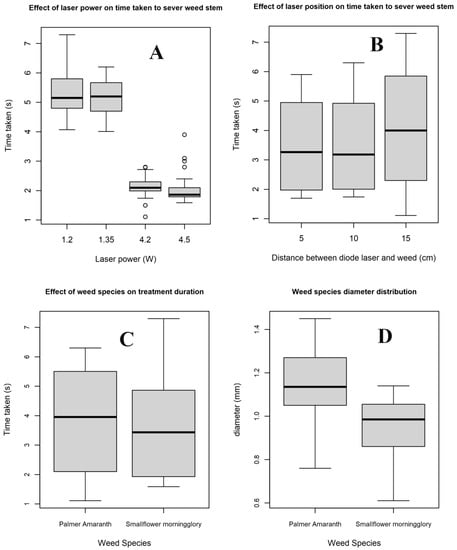 Box and whisker plots of the time taken to cut the weed stem vs. three factors, and the diameter data for each weed species. (A) shows the laser power effect where the error bars for first class (1.2 and 1.35W) lasers overlap significantly, likely, the second class (4.2 and 4.5W) lasers overlap, while the two classes not overlapping, hence the statistical significant difference between the classes while no difference within classes, (B) shows the effect of distance between laser diode and weed stem where the error bars overlap more between 5 and 10cm with less overlap at 15cm which caused the statistical difference, (C) represents the effect of species where the error bars overlap with no statistical difference, and (D) represents the diameters data for each weed species with palmer amaranth having slightly higher average diameter than smallflower morningglory.